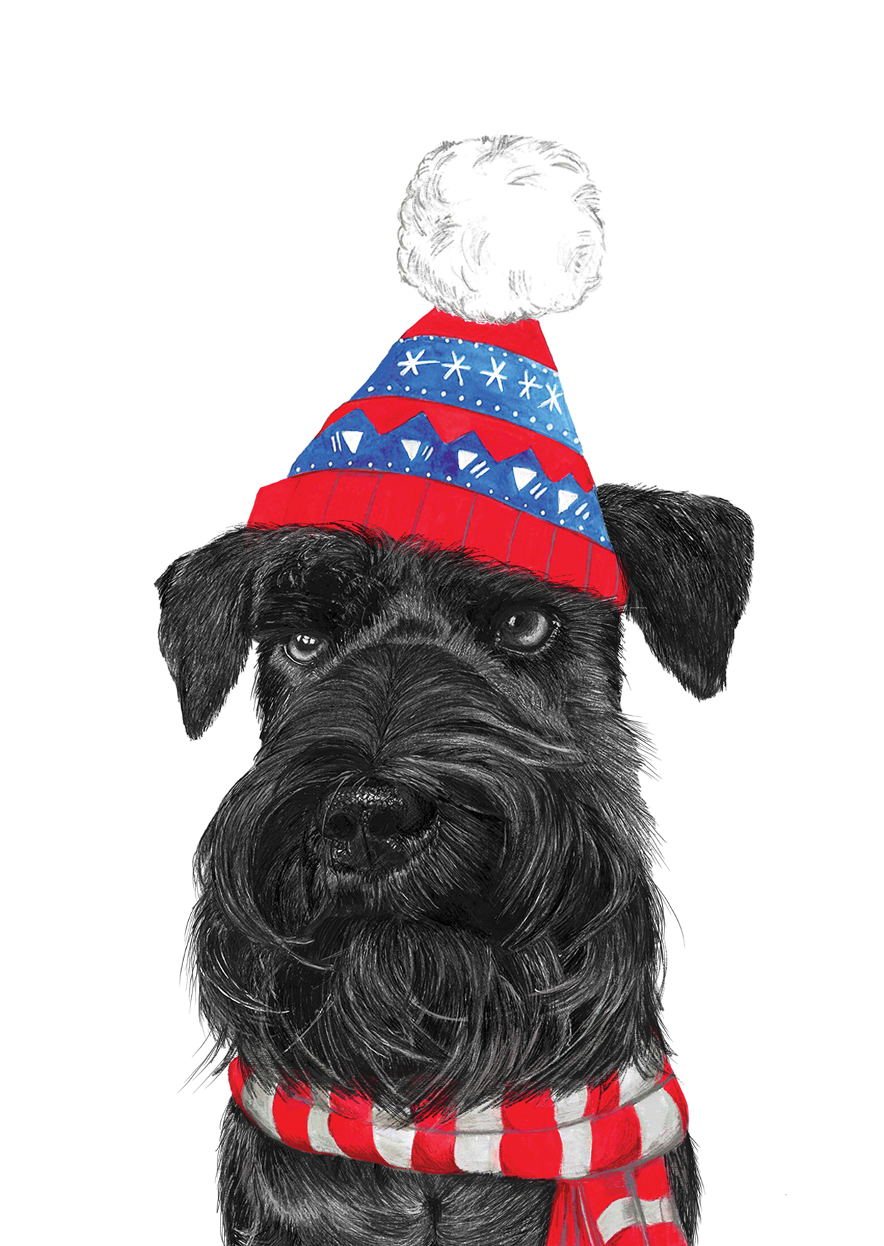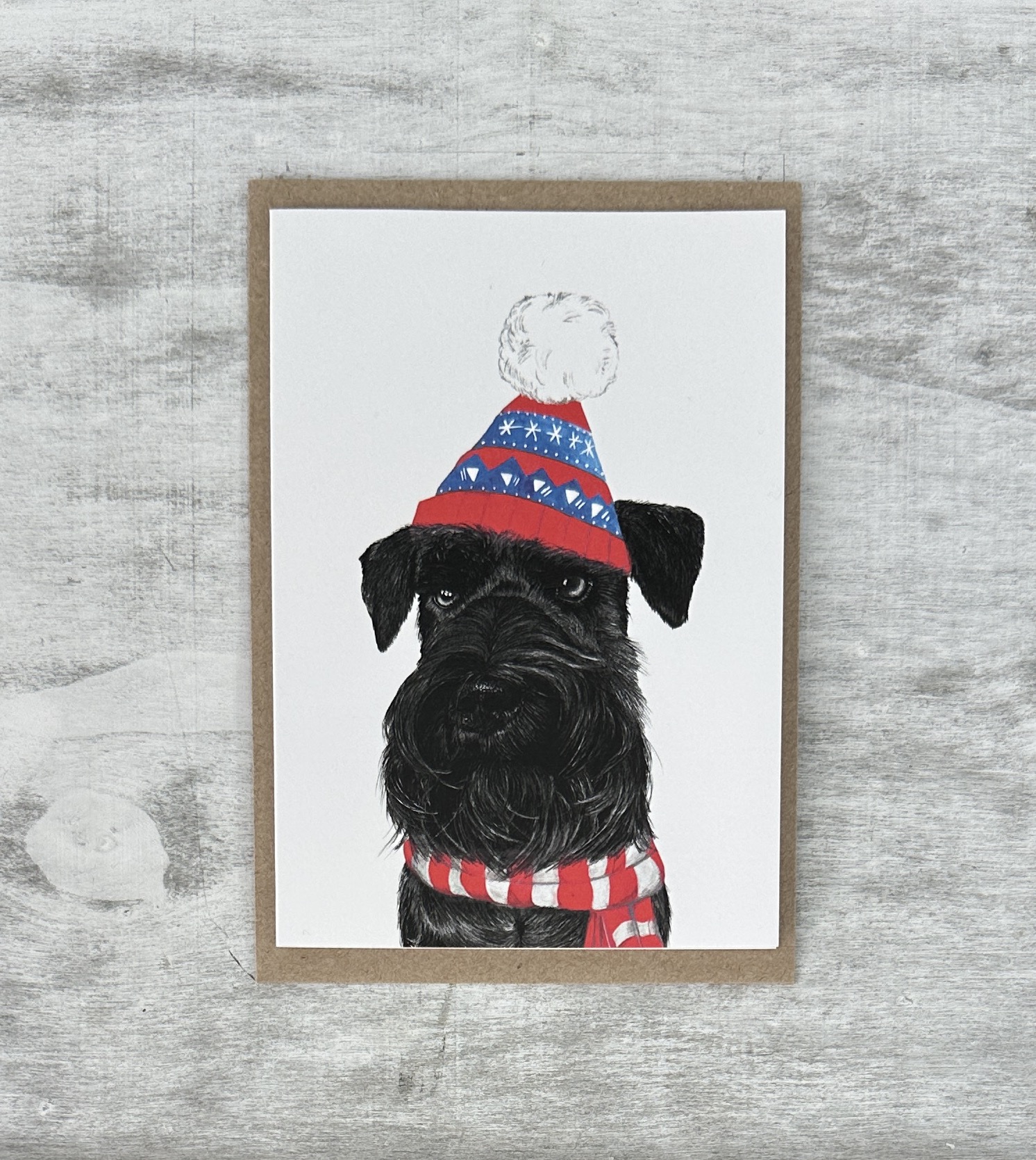 This card features a Miniature Black Schnauzer wearing a woolly hat and scarf.