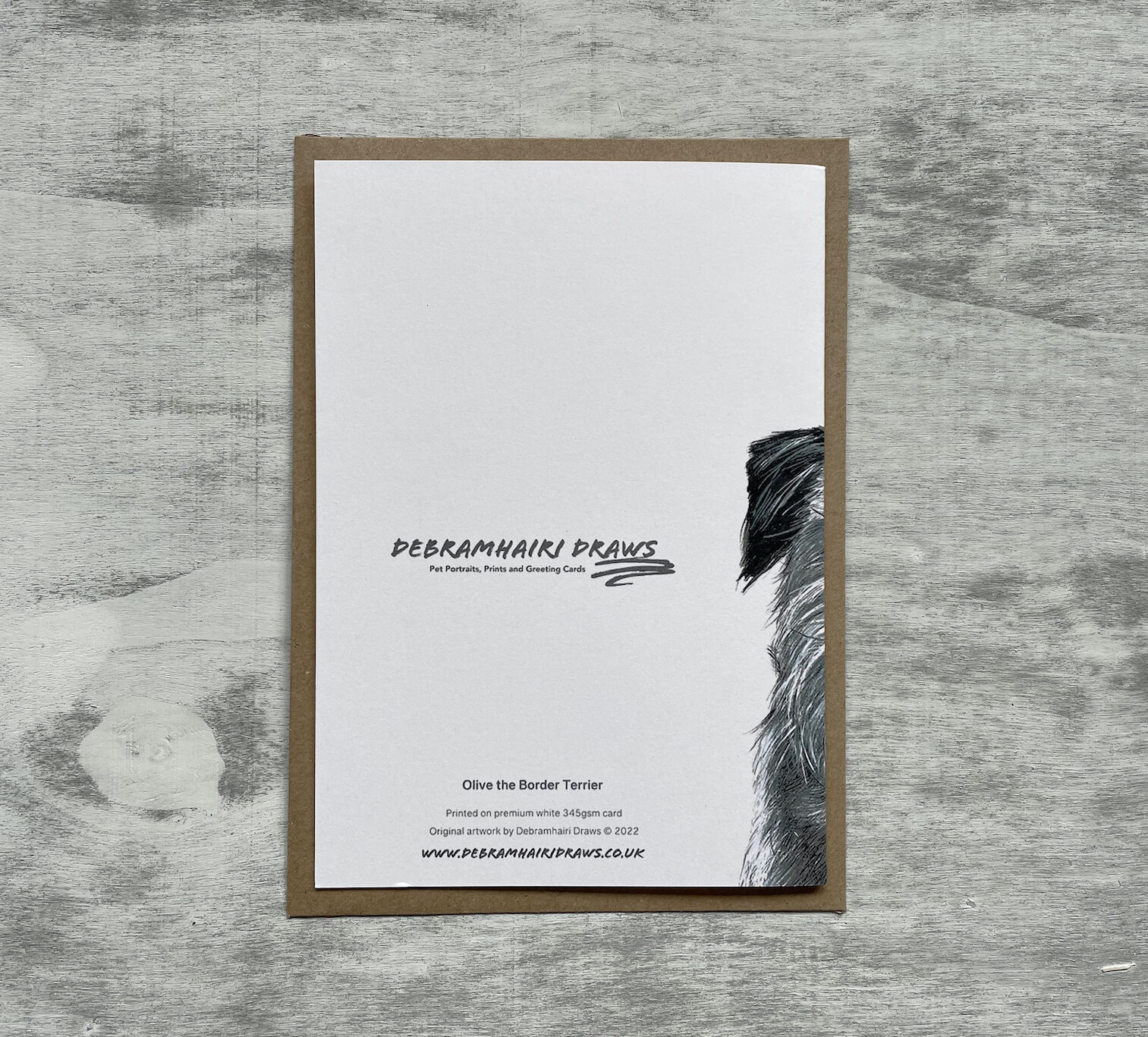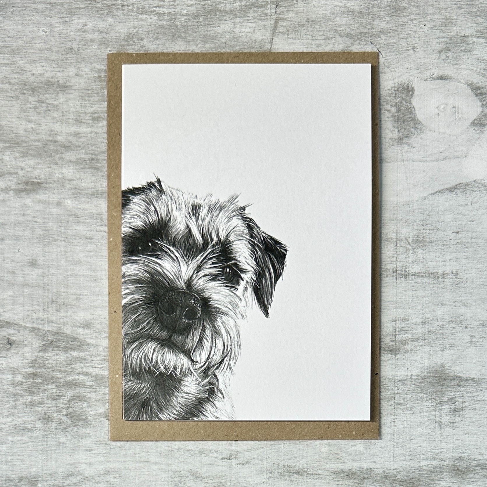 Border Terrier Fine Art Greeting Card – A blank card for any occasion, featuring a beautifully illustrated Border Terrier that wraps playfully around the fold.