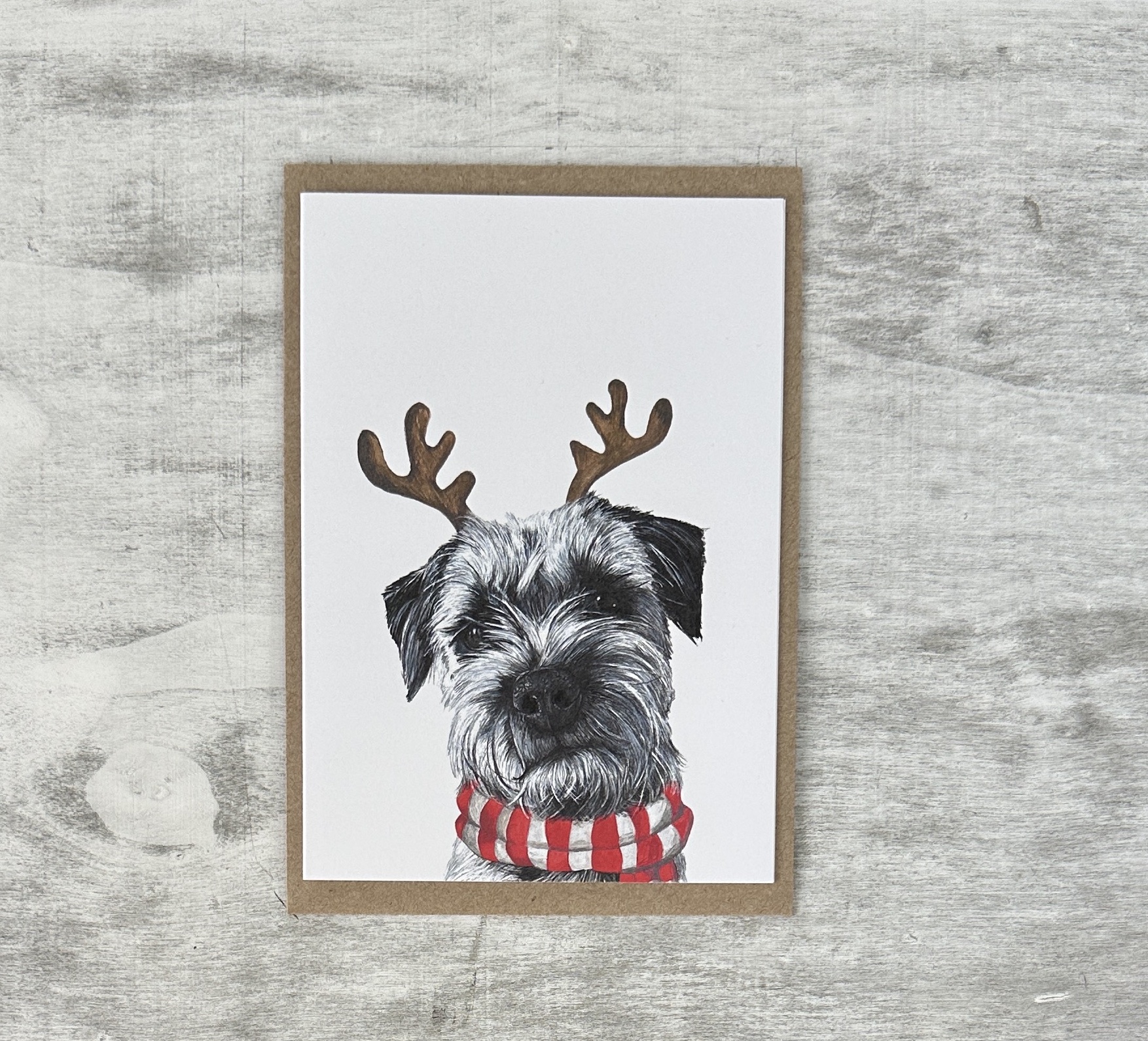 Art cards professionally printed with high quality inks on premium white card with brown envelope and recyclable card clasp stickers. The design is from an original black and white pen and ink drawing with the addition of reindeer ears by Debra Mhairi.