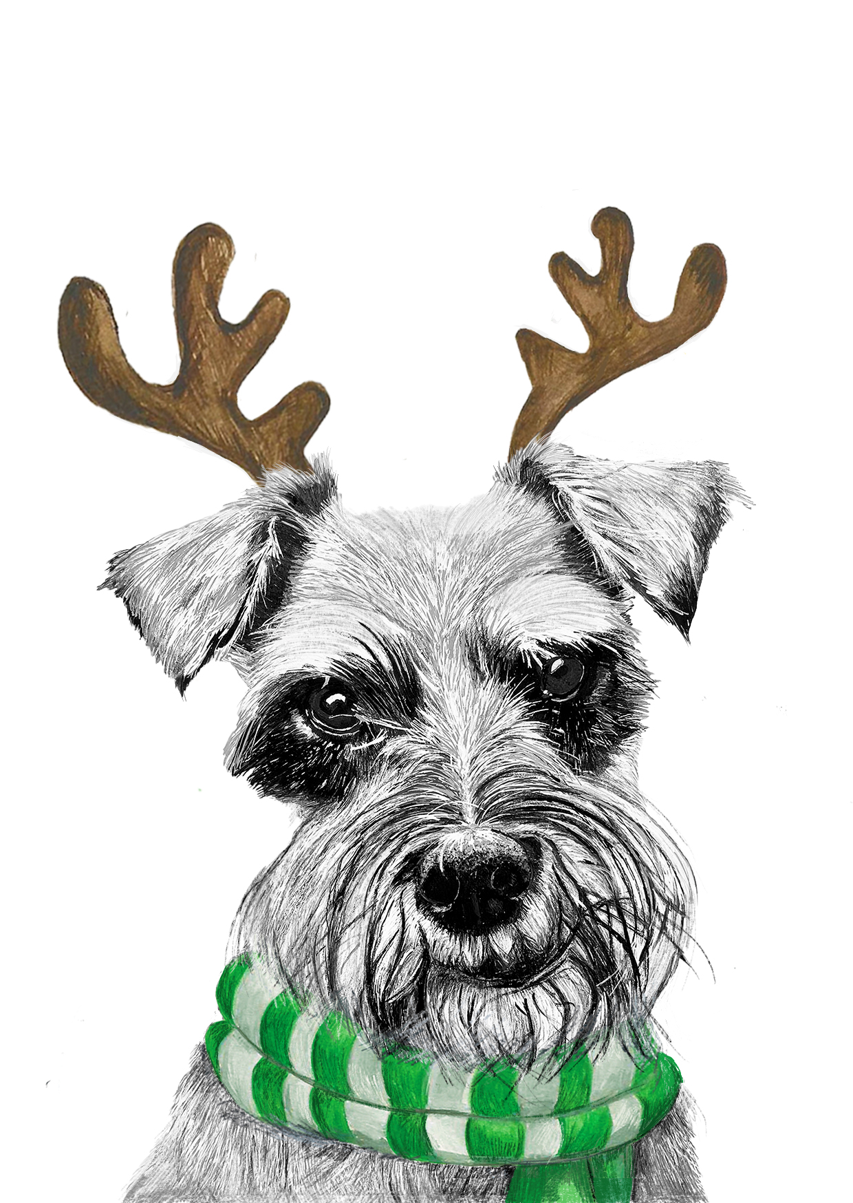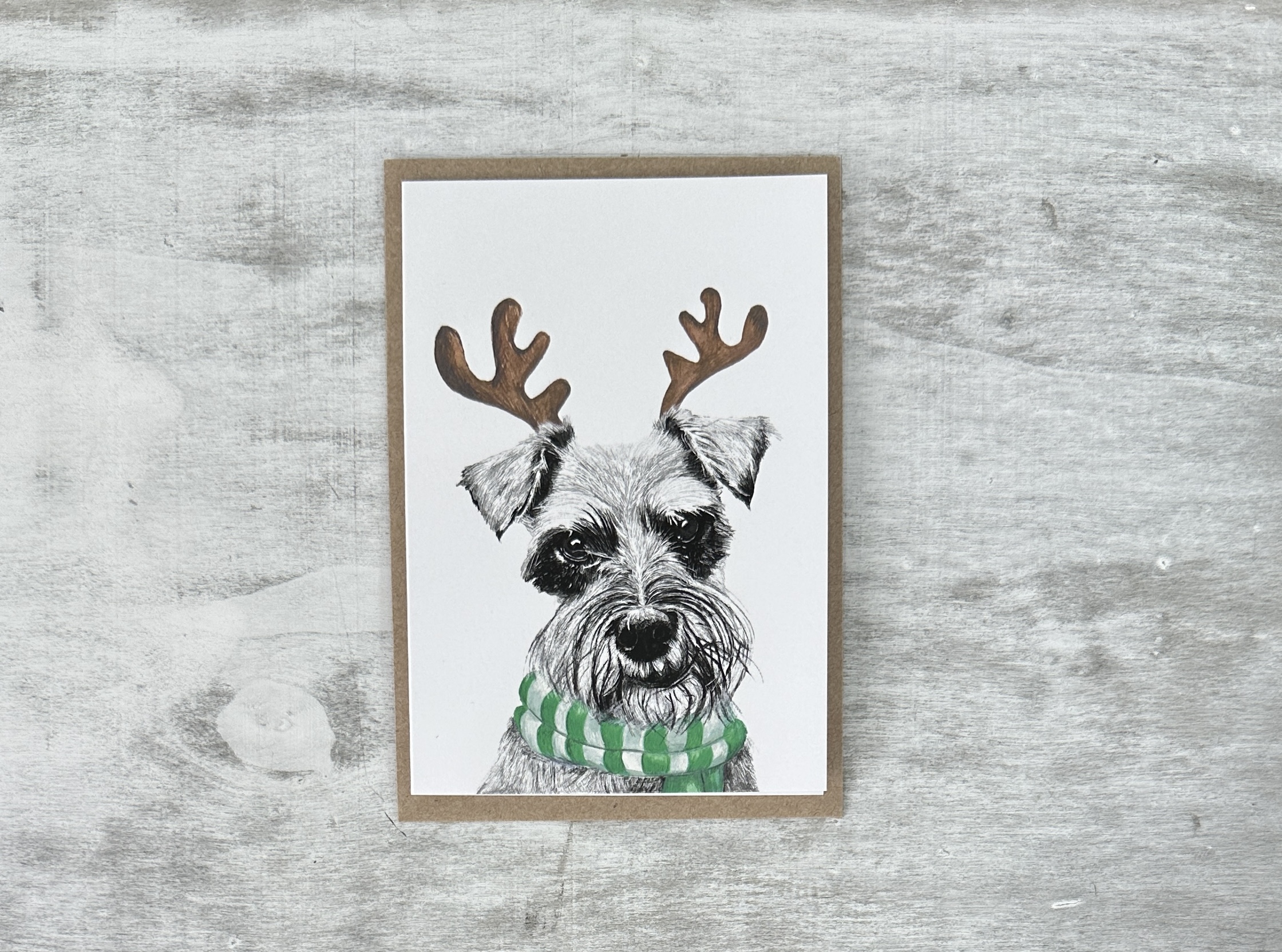 This card features a Miniature Schnauzer wearing Reindeer Antlers and a woolly scarf.